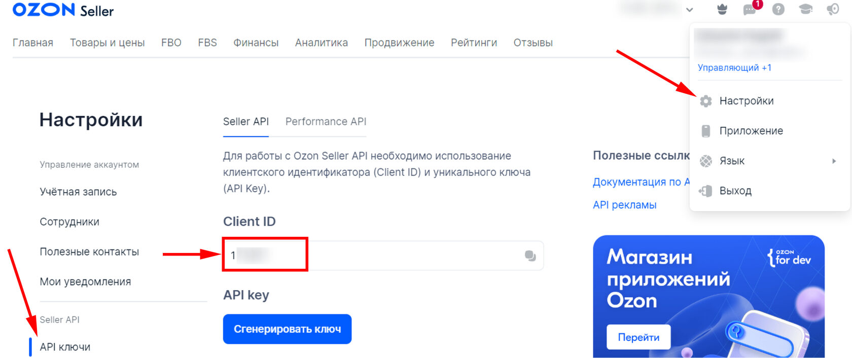 Переходим в личный кабинет ОЗОНа, копируем и вставляем Client ID с личного кабинета ОЗОН, находится в разделе "Настройки" - "API ключи".