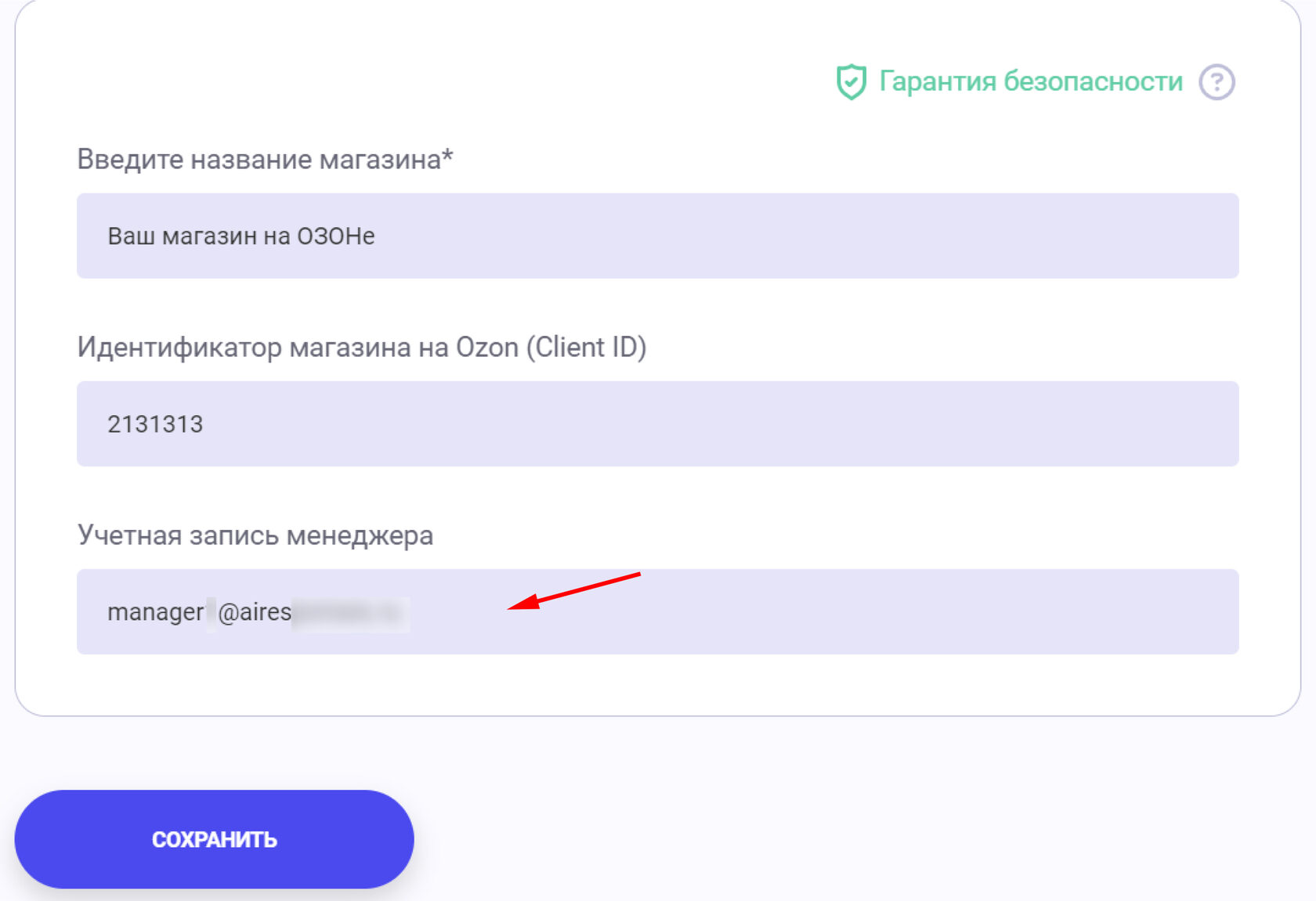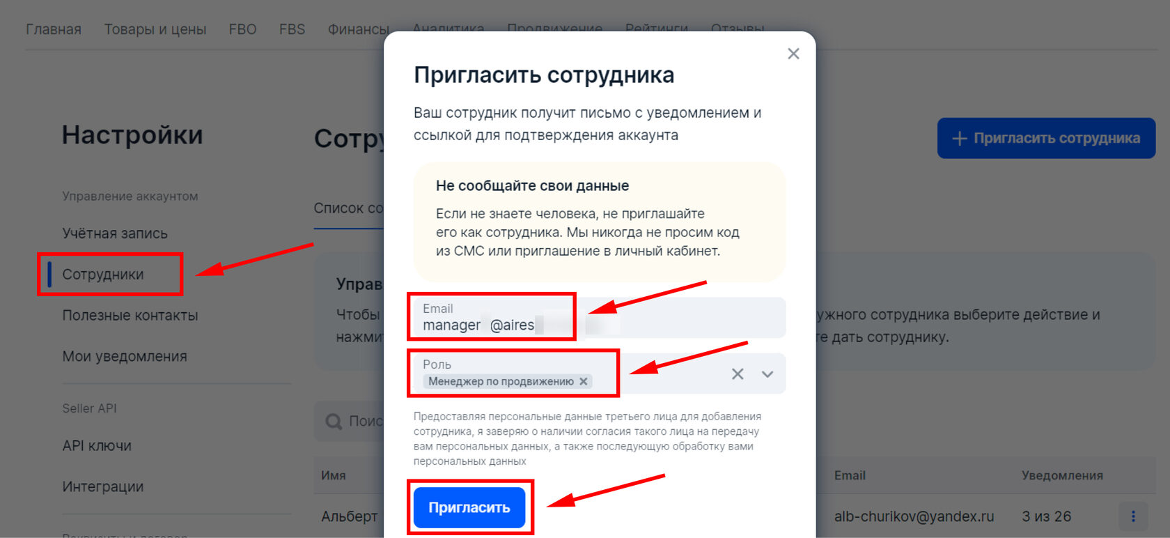Вставляем его в личный кабинет ОЗОНа с правами "Менеджер по продвижению", отправляем приглашение.