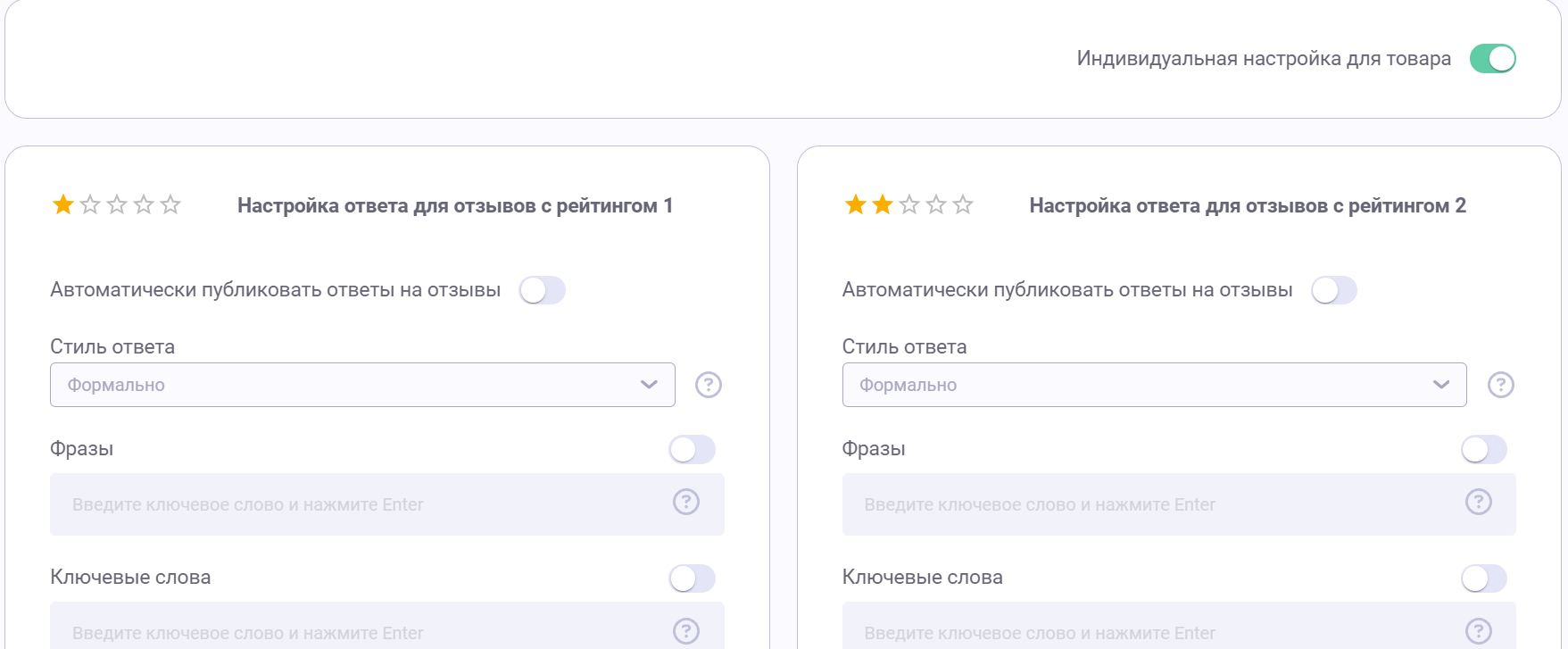 "Автопубликация выключена" - ответ на отзыв будет сгенерирован нейросетью, но отправить сможете его вы самостоятельно.
