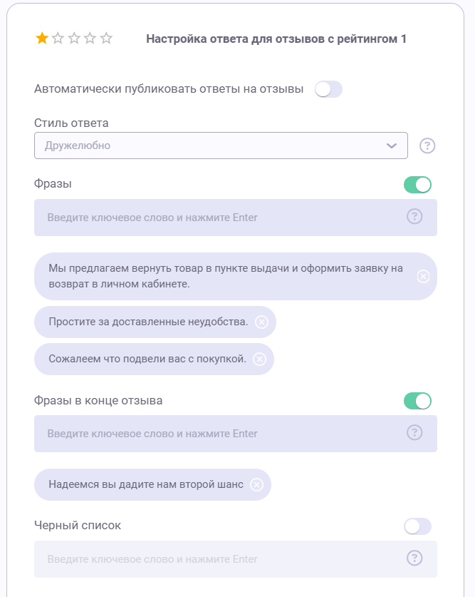 "Автопубликация выключена" - ответ на отзыв будет сгенерирован нейросетью, но отправить сможете его вы самостоятельно.