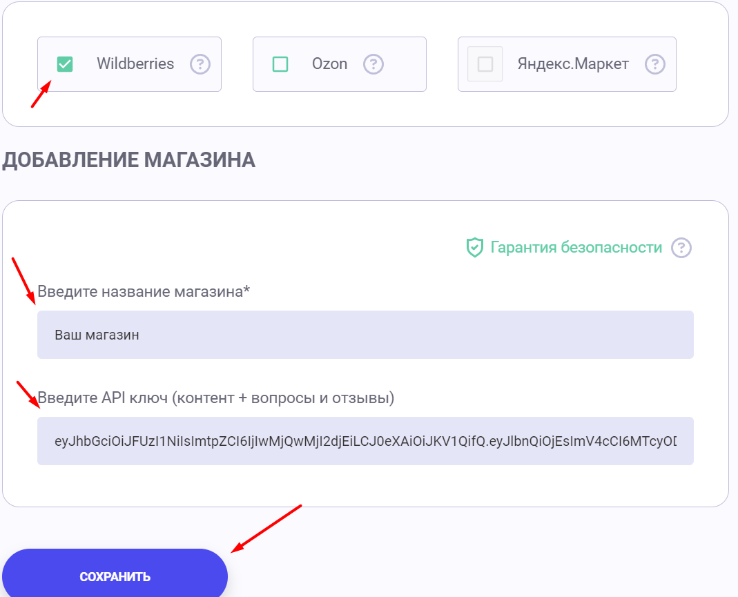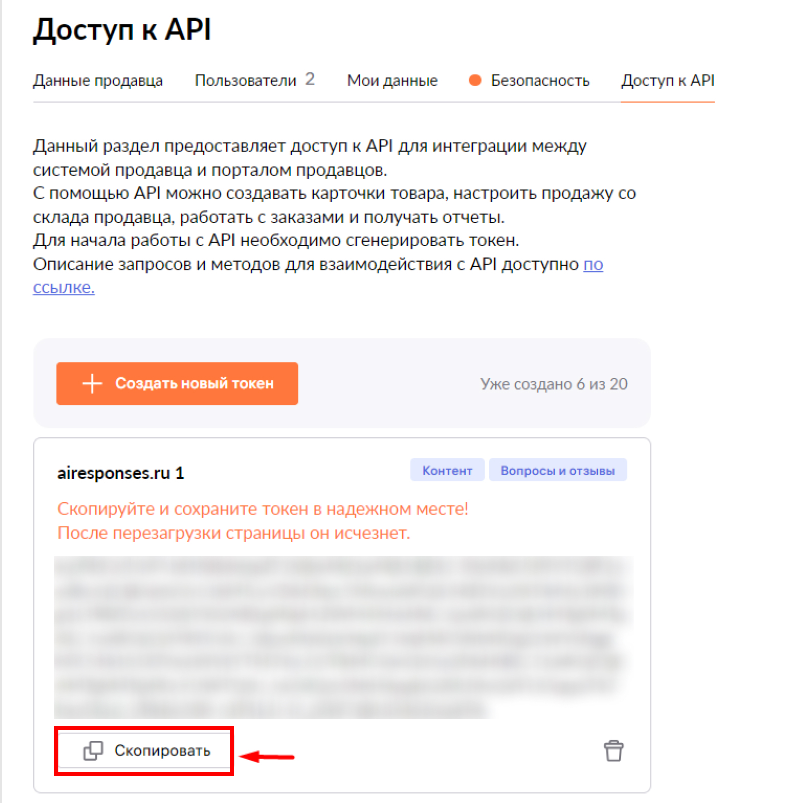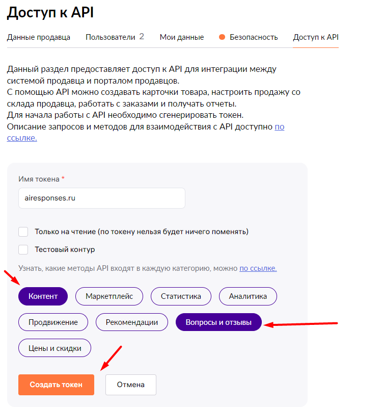 В личном кабинете Wildberries заходим в раздел "Доступ к API" и задаем название токена. Выбираем "Контент" и "Вопросы и отзывы", нажимаем "Создать токен":